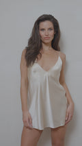 A graceful V-cut back, adorned with a romantic flower petal detail, adds a touch of delicate femininity to this luxury silk nightwear piece. Perfect for relaxing evenings or sophisticated lounging, the Sienna dress is a must-have for those who appreciate understated elegance and soft romance.